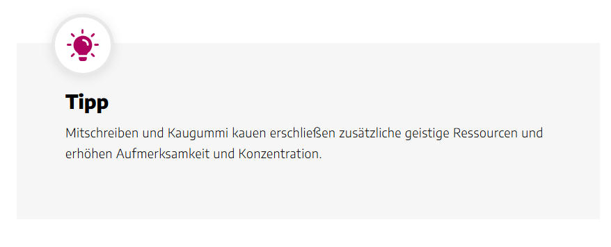 Akute Unterstützung erhält unser Gehirn direkt während wir uns bewegen. Wir bewegen uns sozusagen mental. Dabei kommt es nicht auf körperliche Höchstleistungen an. Bewegungen zur akuten Förderung der geistigen Fitness sind meist kleine Begleitaktivitäten, die dennoch die grauen Zellen ankurbeln und uns zum Weitermachen motivieren. Sich beispielsweise im Unterricht oder bei Telefonaten Notizen zu machen, nebenbei auf einem Block zu „kritzeln“ oder Kaugummi zu kauen, fördert Aufmerksamkeit und Konzentration. Voraussetzung ist, dass die Bewegungen so unkompliziert sind, dass sie automatisiert ablaufen können – ansonsten verbrauchen sie selbst zu viel Energie und lenken ab.