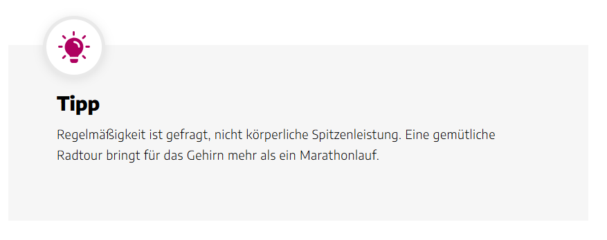 • Dreimal pro Woche 30 Minuten leichtes Ausdauertraining haben einen spürbaren Effekt auf die Gehirnleistung – aber suchen Sie sich dazu eine Art der Bewegung aus, die Ihnen Freude bereitet.