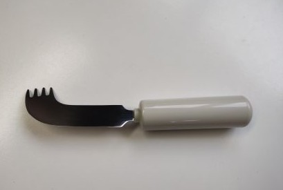 Einhandbesteck Nelson mit nicht scharfer Messerklinge mit Gabelspitzen erleichtert einhändiges Essen. Die Messerklinge kann mit Wiegebewegungen benutzt werden, die Spitze der Klinge verfügt über Zinken und kann gleichzeitig als Gabel verwndet werden.