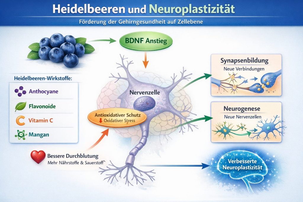 Heidelbeeren fördern die Neuroplastizität, indem ihre Anthocyane (Flavonoide) als Antioxidantien das Gehirn vor Stress schützen, die Kommunikation der Nervenzellen verbessern und die Bildung neuer neuronaler Verbindungen unterstützen, was sich in verbesserter kognitiver Leistung, Gedächtnis und Reaktionsfähigkeit zeigt.