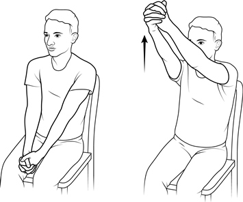Heben Sie Ihre Arme nach vorne und oben zur Decke. Halten Sie die Ellbogen gerade und die Daumen nach oben.
