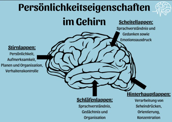 Im Gehirn, vor allem im Großhirn, sind unterschiedliche Bereiche für unterschiedliche Aufgaben zuständig. Vieles deutet darauf hin, dass Persönlichkeitsmerkmale vorwiegend im Frontalhirn verankert sind, welches direkt hinter der Stirn liegt. Wird dieser Bereich nun durch einen Schlaganfall beschädigt, kann das Spuren auf der Persönlichkeit hinterlassen.