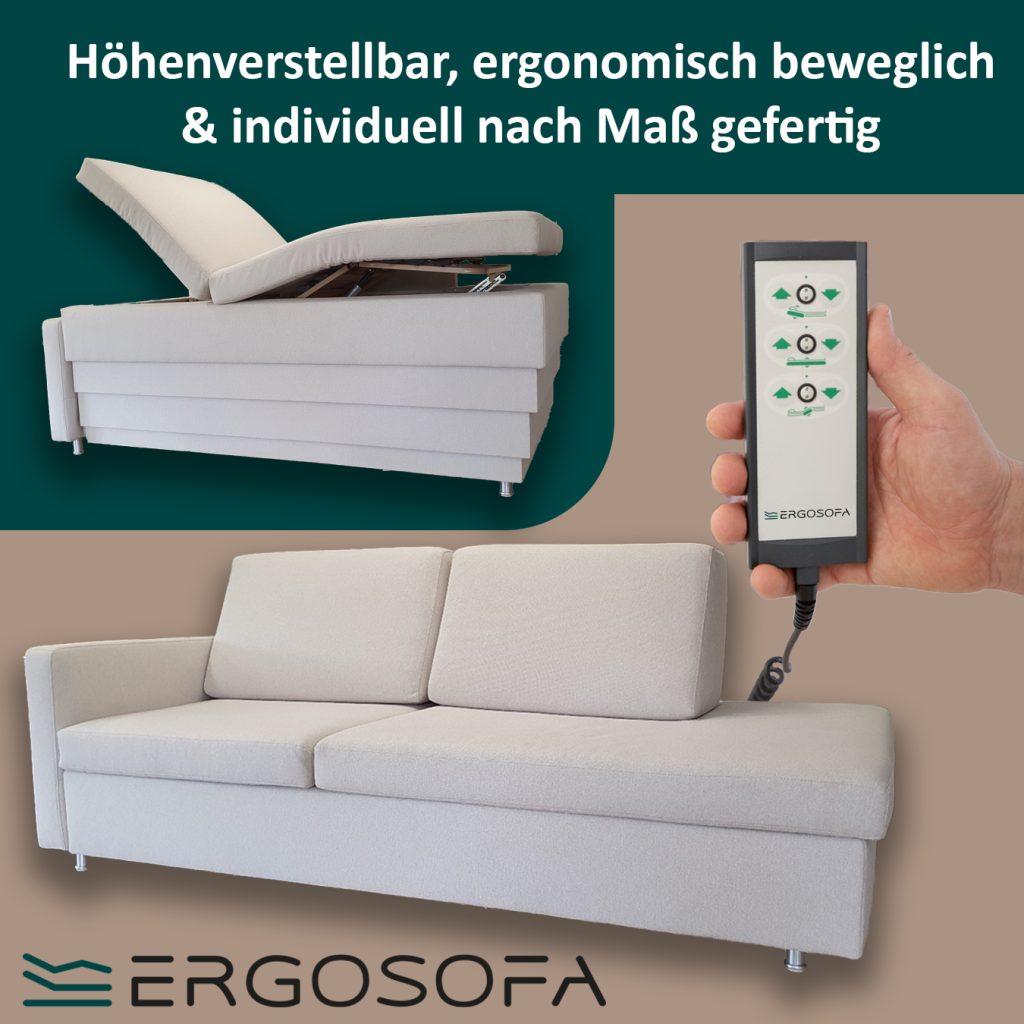 Das Ergosofa ist in der Höhe verstellbar. Weiters kann auch der Fußteil sowie auch der Rückenteil in ihrer Position elektrisch verstellt werden. Die Funktion ist ähnlich des eines Pflegebettes.