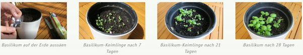 Nachdem ihr die Basilikumsamen auf der Erde ausgesät und bewässert habt, empfehlen wir euch den Topf mit einer Frischhaltefolie abzudecken. So entsteht im Topf ein warmes, feuchtes Gewächshausklima wodurch die Samen zur schnellen Keimung angeregt werden. Damit die Luftzufuhr in eurem so entstandenen Gewächshaus erhalten bleibt, stecht ihr die Frischhaltefolie mit einem Messer einige Male ein. Nach wenigen Tagen keimen die Basilikumsamen bereits. Sobald die Keimlinge sichtbar sind, brauchen sie viel Licht. Innerhalb von etwa 4 Wochen entwickeln sich dann die Samen zu der reifen Basilikumpflanze.