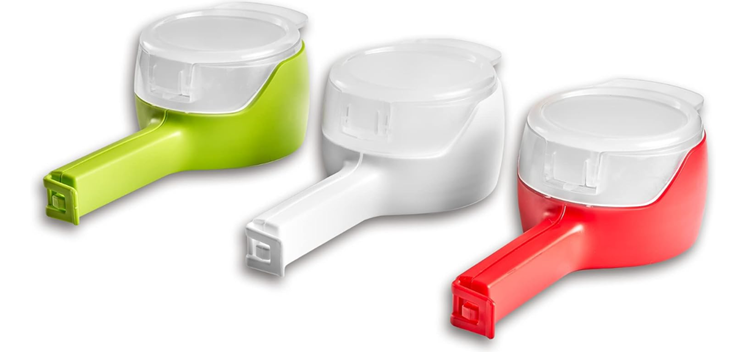 Hygienischer Beutel- und Snack-Spender als Frischeverschluss für alle Arten von Plastik und Papiertüten: Müsli, Nüsse, Reis, Nudeln, Mehl, Zucker, Kaffee, Tee, Tierfutter und vieles mehr. Den Spender an die Tüte festklemmen und durch den Klappdeckel ausgießen und Deckel wieder verschließen. Der Clip muss während der Verwendung nicht entfernt oder abgenommen werden.