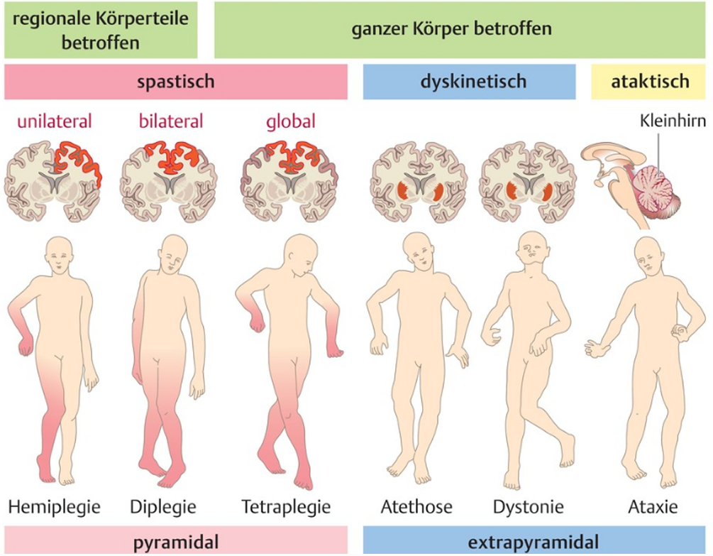 Die wichtigsten Formen der Zerebralparese werden nach dem Ort der Schädigung im Gehirn unterschieden (vgl. Abb. 17):