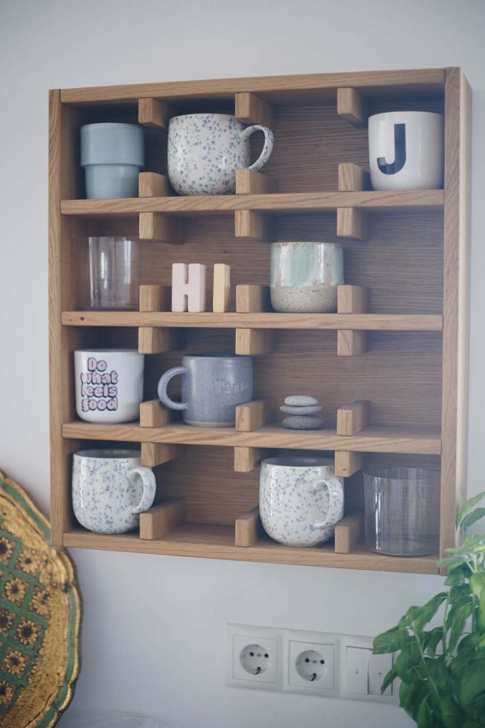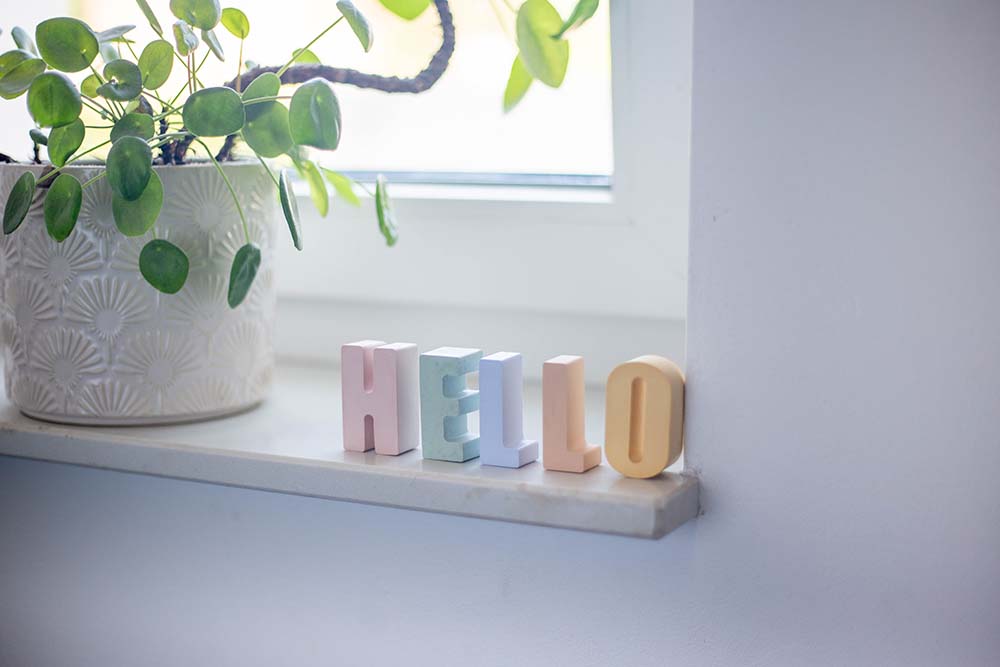 Die bunten Buchstaben könnt ihr natürlich wild kombinieren – bei mir ist es ein Hello (und ein Hallo habe ich auch noch gemacht) für den Eingangsbereich geworden. Inzwischen ist es auch schonmal ins Gästebad gewandert, und auch das Hi im Tassenregal macht sich super finde ich.