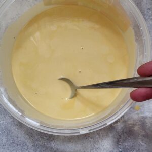 Im nächsten Schritt destilliertes Wasser im Verhältnis 3:1 (Gießmasse zu Wasser) zufügen. Achtung, solltet eure Gießmasse ein anderes Verhältnis vorgeben, dann haltet euch daran! Für 200 Gramm Gießmasse habe ich 67 Milliliter Wasser verwendet. Gut verrühren, bis eine gleichmäßige Masse entsteht.