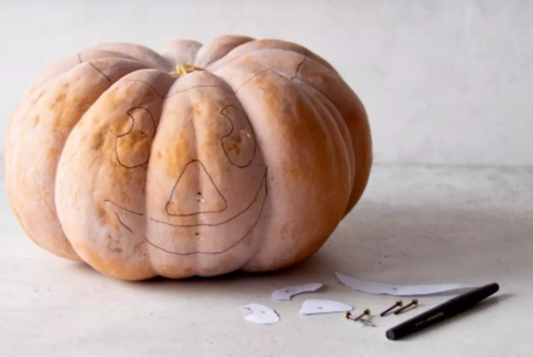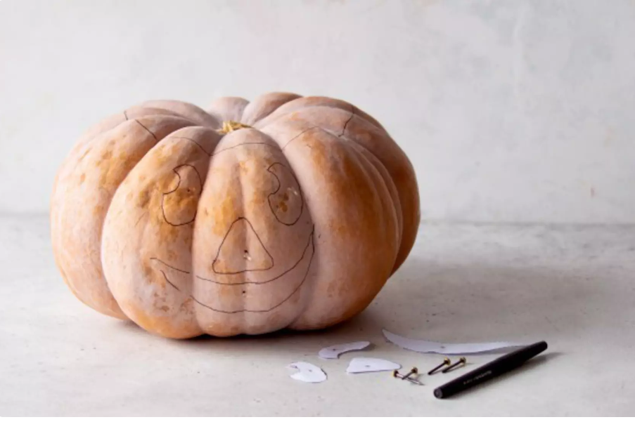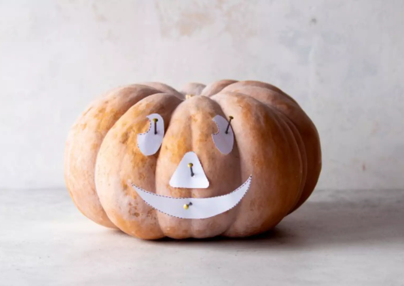 Zeichne die angehefteten Augen, Nase und Mund mit einem wasserlöslichen Stift nach und entferne anschliessend die Vorlagen wieder vom Kürbis. Die Vorlagen können mehrfach genutzt werden und müssen daher nicht direkt in den Abfall wandern.