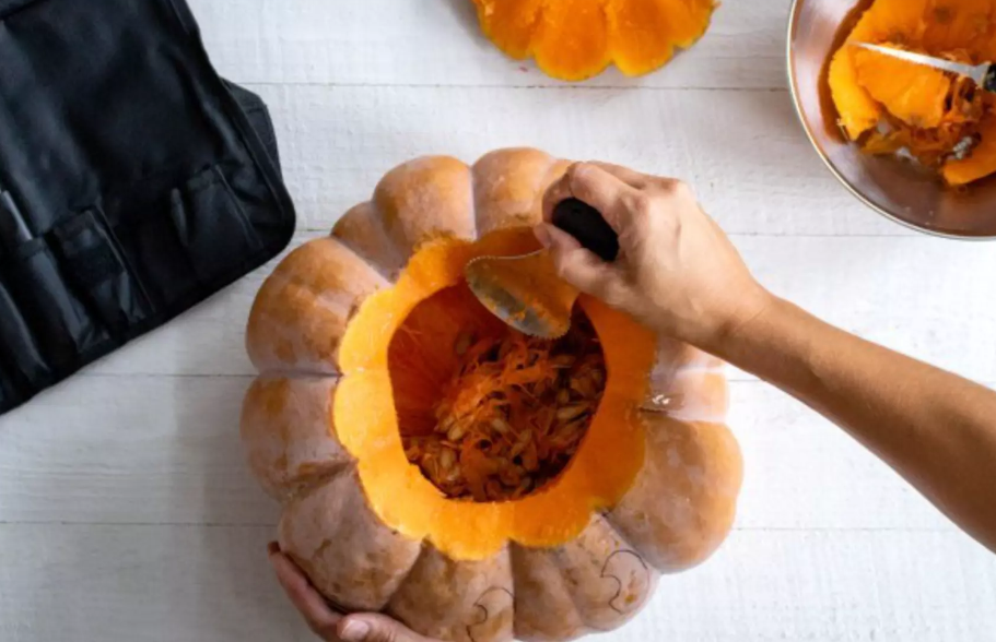 Alles Fleisch und alle Fasern müssen raus! Die gewonnenen Kerne können geröstet und danach als Snack weiterverwendet und das Kürbisfleisch als Suppe weiterverarbeitet werden – natürlich nur, wenn ein Speisekürbis verwendet wurde!