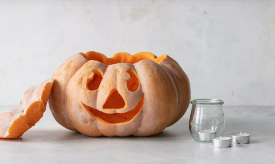 Jetzt fehlt nur noch die Kerze. Je nach Grösse deines Kürbisses haben auch mehrere Kerzli darin Platz. Optional kannst du die Lichtquelle auch in ein Konfiglas stellen. Das macht das Anzünden ausserhalb des Kürbisses etwas einfacher.