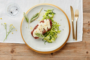 Wenig Öl in einer Bratpfanne erhitzen. Entrecôtes bei mittlerer Hitze beidseitig je ca. 4 Minuten anbraten. Beiseitestellen und ca. 15 Minuten zugedeckt ruhen lassen. Backofen auf 220 °C vorheizen. Zucchetti in ca. 5 mm dünne Streifen, Knoblauch in feine Scheiben schneiden und beiseitestellen. Mozzarella halbieren und in ca. 5 mm dicke Scheiben schneiden. Entrecôtes in einer Gratinform mit Mozzarella belegen. In der Ofenmitte ca. 5 Minuten überbacken.