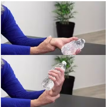 Legen Sie eine Wasserflasche in Ihre betroffene Hand und krümmen Sie dann Ihre Finger, um die Wasserflasche zu greifen. Lassen Sie dann den Griff los. Wiederholen Sie diese Übung insgesamt 10-mal.