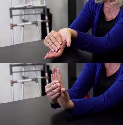 Legen Sie Ihren Ellenbogen auf einen Tisch und beugen Sie dann mit der nicht betroffenen Hand die betroffene Hand am Handgelenk. Dehnen Sie sie nach hinten und dann nach vorne. Führen Sie diese Bewegung langsam für insgesamt 5 Wiederholungen aus.
