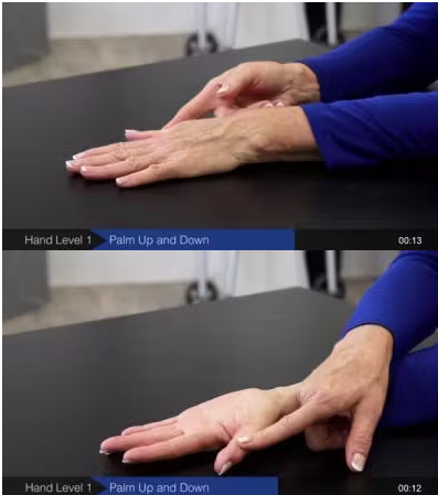 Legen Sie Ihre Hand mit der Handfläche nach oben auf eine Tischplatte. Benutzen Sie dann Ihre nicht betroffene Hand, um Ihre Handfläche nach unten zu kippen. Wiederholen Sie den Vorgang vor und zurück: Handfläche nach oben, Handfläche nach unten. Wiederholen Sie dies insgesamt 10-mal.