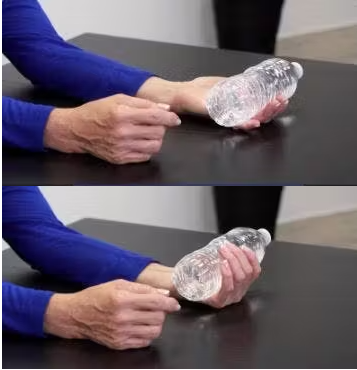 Stellen Sie eine Wasserflasche auf einen Tisch und schieben Sie sie mit der Rückseite Ihres betroffenen Handgelenks über den Tisch. Versuchen Sie so gut wie möglich, dabei die Schulter nicht hochzuziehen.