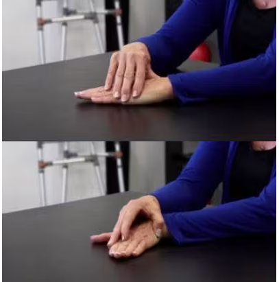 Legen Sie Ihre betroffene Hand mit der Handfläche nach unten auf den Tisch. Schieben Sie Ihre Hand mit der nicht betroffenen Hand nach links und dann nach rechts. Konzentrieren Sie sich darauf, die Bewegung ausschließlich aus Ihrem Handgelenk heraus durchzuführen. Wiederholen Sie die Übung langsam für insgesamt 10 Wiederholungen.