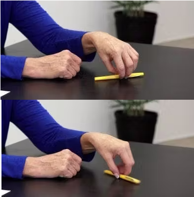 Wenn Sie sich dazu bereit fühlen, können Sie diese fortgeschrittene Schlaganfallübung ausprobieren, bei der Sie einen Stift mit der betroffenen Hand drehen. Da dies eine schwierige Bewegung sein kann, sollten Sie sie nur durchführen, wenn Sie sie als herausfordernd und nicht als frustrierend empfinden.