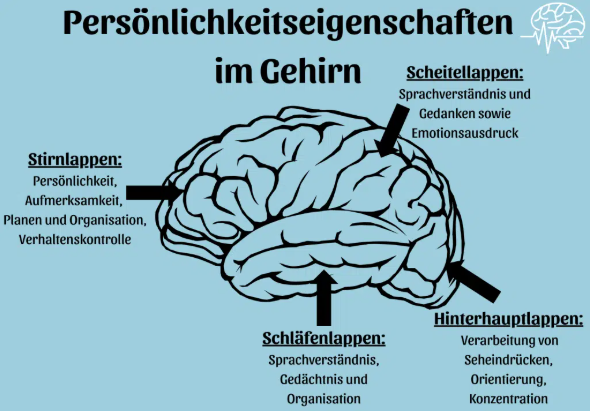 Im Gehirn, vor allem im Großhirn, sind unterschiedliche Bereiche für unterschiedliche Aufgaben zuständig. Vieles deutet darauf hin, dass Persönlichkeitsmerkmale vorwiegend im Frontalhirn verankert sind, welches direkt hinter der Stirn liegt. Wird dieser Bereich nun durch einen Schlaganfall beschädigt, kann das Spuren auf der Persönlichkeit hinterlassen.