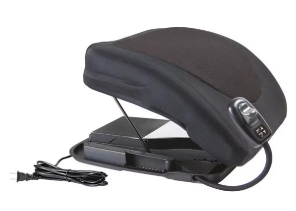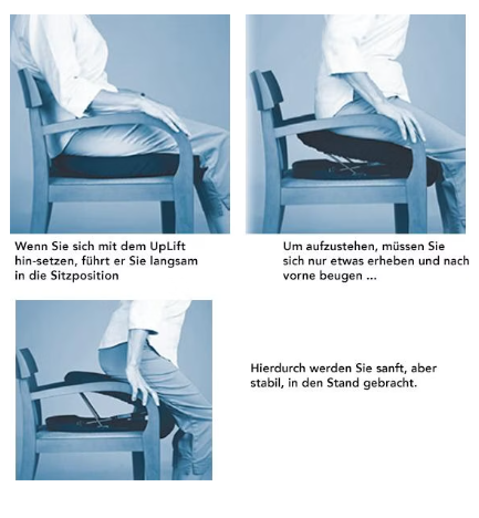 Dieses tragbare Kissen wurde für die Verwendung mit Stühlen mit Armlehnen entwickelt, die über eine ausreichend stabile Sitzfläche verfügen. Es funktioniert mithilfe eines eingebauten Kolbens, der sich leicht auf das Gewicht des Benutzers einstellen lässt, und kann ohne Stromzufuhr verwendet werden.