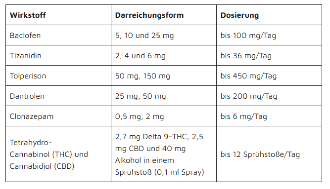 Tabletten und Spray sollten nur eingesetzt werden, wenn eine alltagsrelevante Spastik trotz passender nicht-medikamentöser Maßnahmen nicht ausreichend kontrolliert werden kannn und immer nur nach Rücksprache mit einem Arzt.