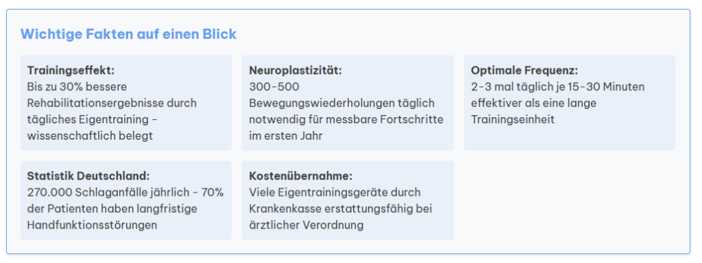 Die gute Nachricht: Mit den richtigen Eigentrainingsgeräten und konsequenter Heimtherapie können Sie die Rehabilitation deutlich beschleunigen. Studien zeigen, dass Patienten, die zusätzlich zur Therapie zuhause trainieren, ihre motorischen Fähigkeiten um bis zu 30 Prozent besser verbessern als jene, die nur in der Praxis üben.