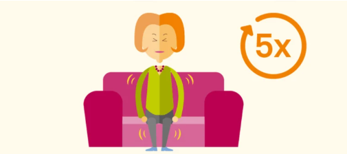 Gesässmuskeln zusammenpressen und beide Beine anspannen: Oberschenkel anspannen, Fersen gegen den Boden drücken, Zehen hochziehen. Loslassen, «hineinspüren».