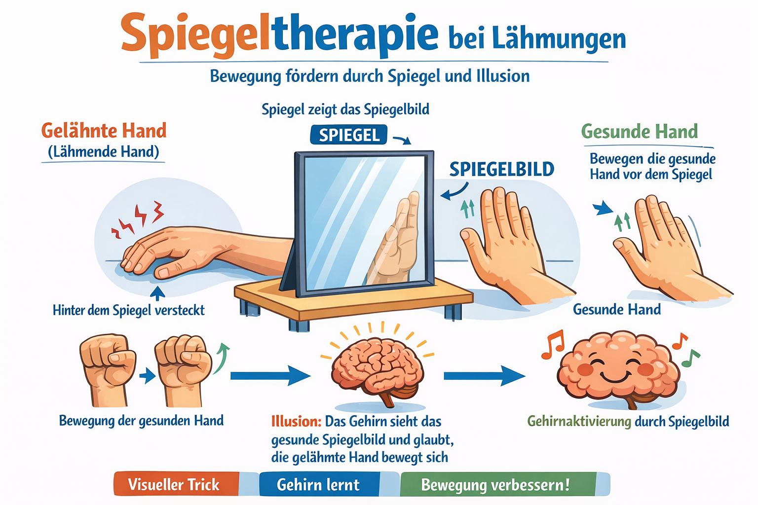 Bei der Spiegeltherapie wird ein Spiegel so positioniert, dass der Patient das Spiegelbild der gesunden Extremität sieht, während die betroffene, gelähmte Seite hinter dem Spiegel verborgen bleibt. Das Gehirn erhält dadurch die visuelle Information, dass sich auch die gelähmte Körperseite normal bewegt. Diese Illusion kann neuronale Netzwerke aktivieren, die für Bewegung und Körperwahrnehmung zuständig sind.