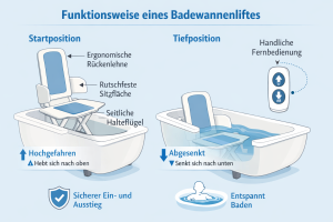 Ein Badewannenlift bietet hier eine komfortable und sichere Lösung, um das Baden wieder selbstständig und angstfrei genießen zu können.