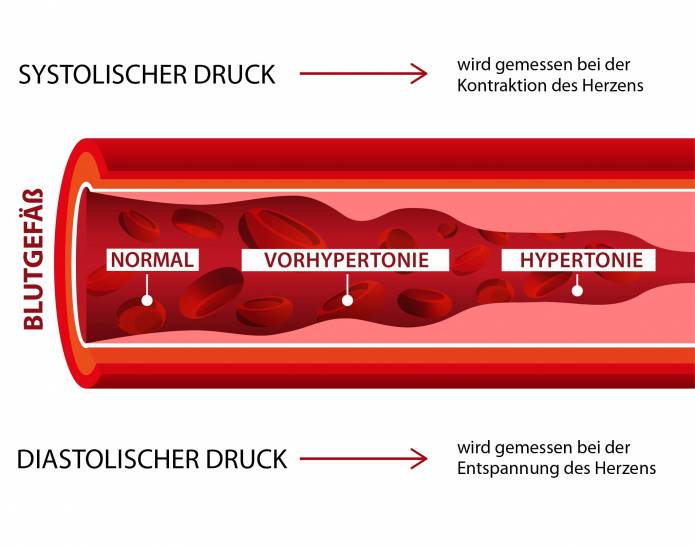 Bei der Blutdruckmessung werden zwei Werte unterschieden: Der systolische Blutdruck misst den Druck während des Herzschlags, wenn der Herzmuskel sich zusammenzieht und sauerstoffreiches Blut in die Gefässe pumpt. Der diastolische Blutdruck misst den Druck auf die Gefässe, wenn der Herzmuskel entspannt ist. Sind einer oder beide Werte für längere Zeit über der Norm, ist das Risiko von Herzkreislauf-Krankheiten erhöht.