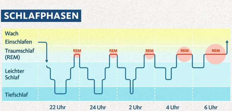 - Verteilung: Zu Beginn der Nacht überwiegt der Tiefschlaf, gegen Morgen werden die REM-Phasen länger.