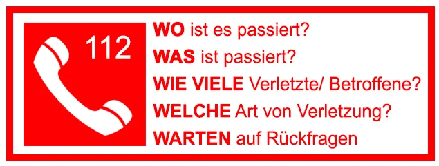 Ein Notruf (112) wird korrekt abgesetzt, indem man Ruhe bewahrt und die 5 W-Fragen beantwortet: Wo, Was, Wie viele, Welche Art von Verletzungen und Warten auf Rückfragen. Wichtig ist, den Standort präzise zu nennen (Ort, Straße, Hausnummer, Stockwerk) und das Gespräch erst zu beenden, wenn die Leitstelle auflegt.