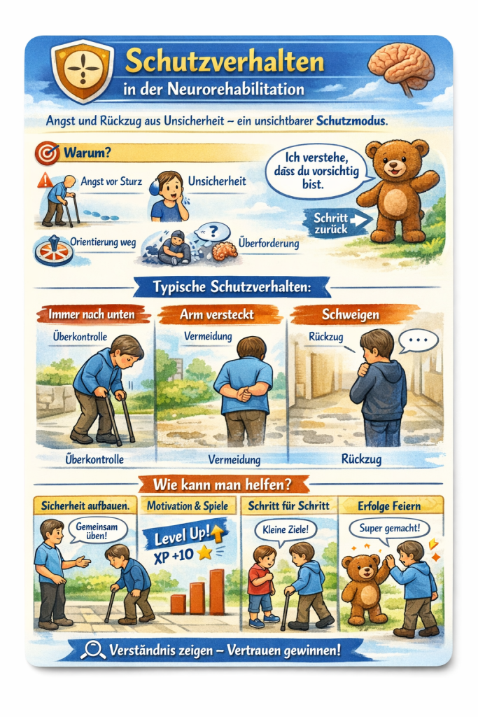 „Schutzverhalten“ in der Neurorehabilitation beschreibt automatische, oft unbewusste Strategien, mit denen sich Patientinnen nach neurologischen Ereignissen vor Unsicherheit, Überforderung oder Stürzen schützen – etwa durch Vermeidung, Überkontrolle oder Rückzug. Diese Muster sind verständlich, aber können langfristig den Fortschritt behindern.